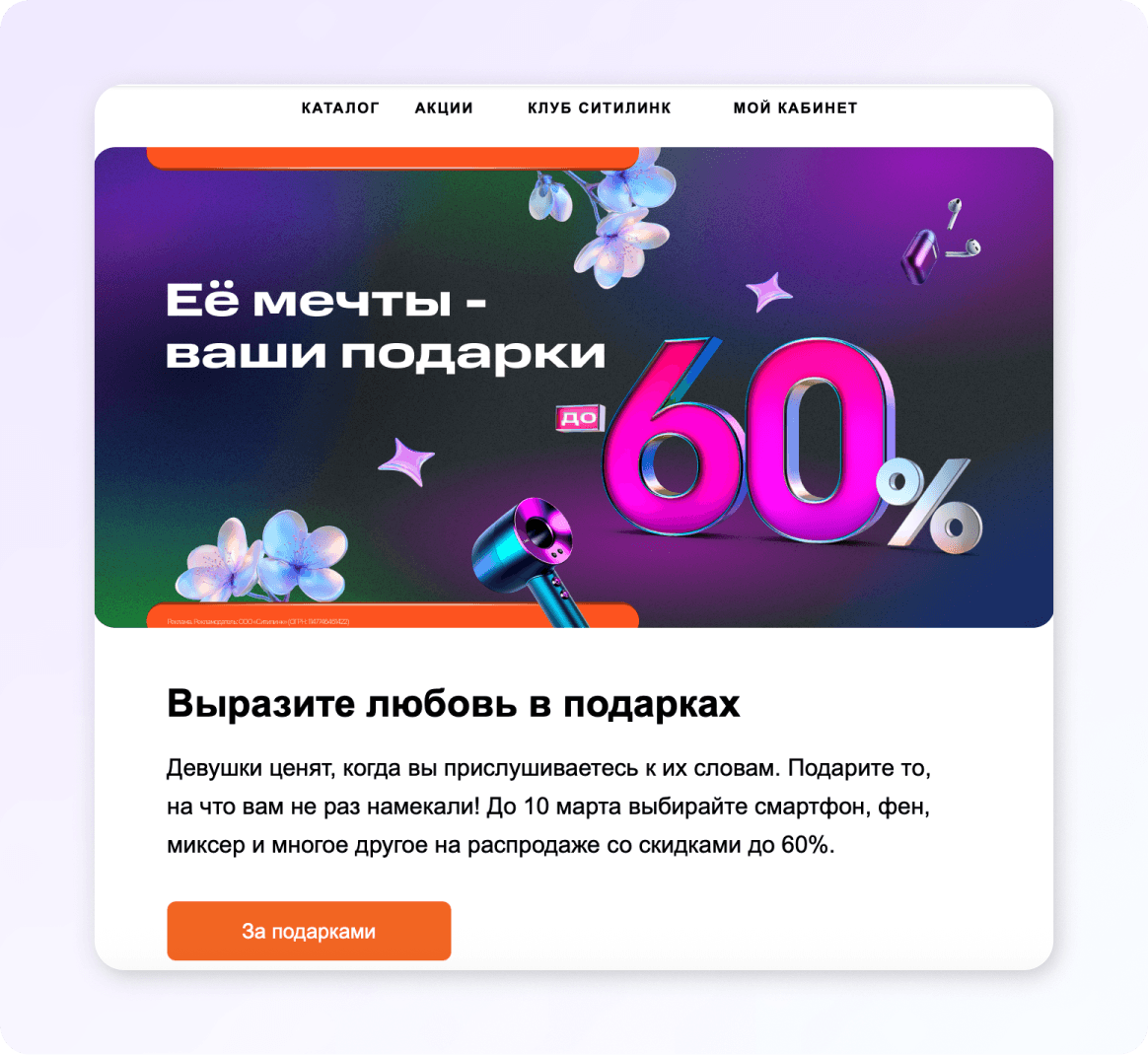 К 8 марта хорошо работают рассылки с напоминаниями о подарках для любимых женщин. Такие сообщения вовремя подталкивают к покупке и упрощают выбор, особенно для тех, кто откладывает решение до последнего момента.