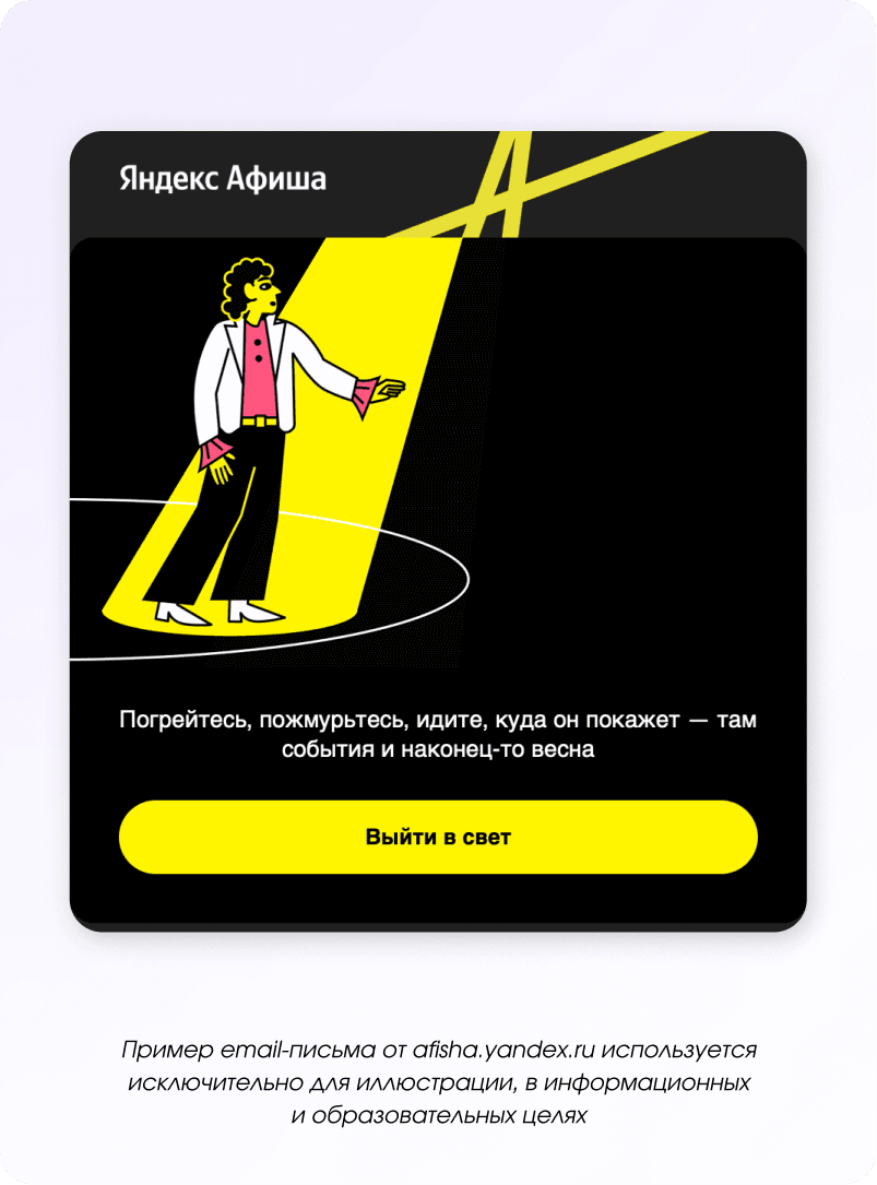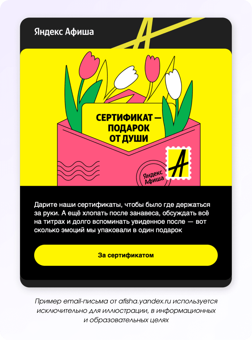 Праздник — это не только про подарки, но и про впечатления, совместный отдых и атмосферу. Поэтому в рассылках можно не продавать напрямую, а подсказывать идеи: куда сходить, где провести время или как устроить небольшой праздник для себя и близких.
