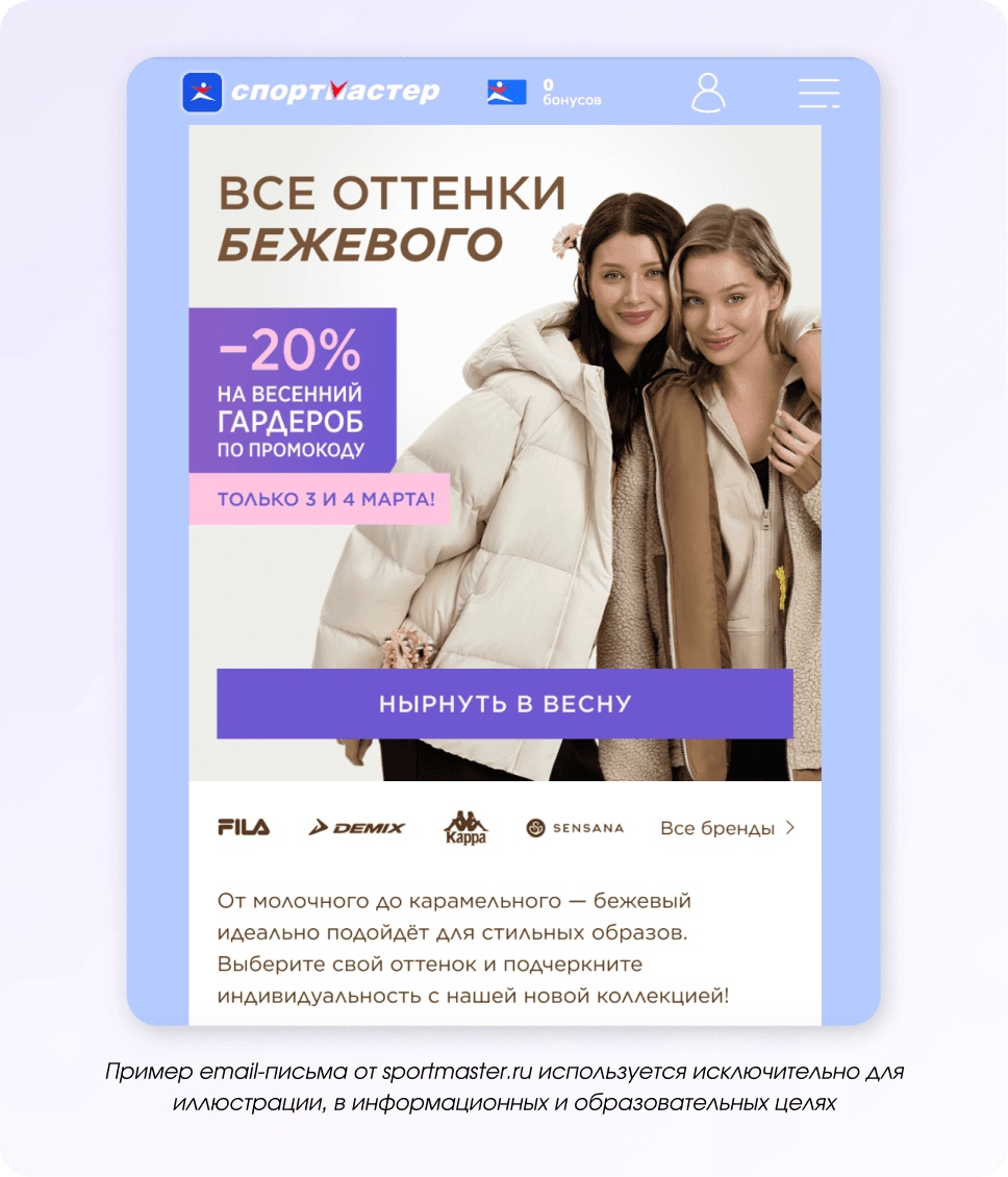 Ещё одна важная часть праздника — внешний вид и настроение, которое создаёт образ. Поэтому брендам одежды, обуви и аксессуаров логично делать отдельные рассылки для женской аудитории с готовыми идеями нарядов и подборками к случаю.