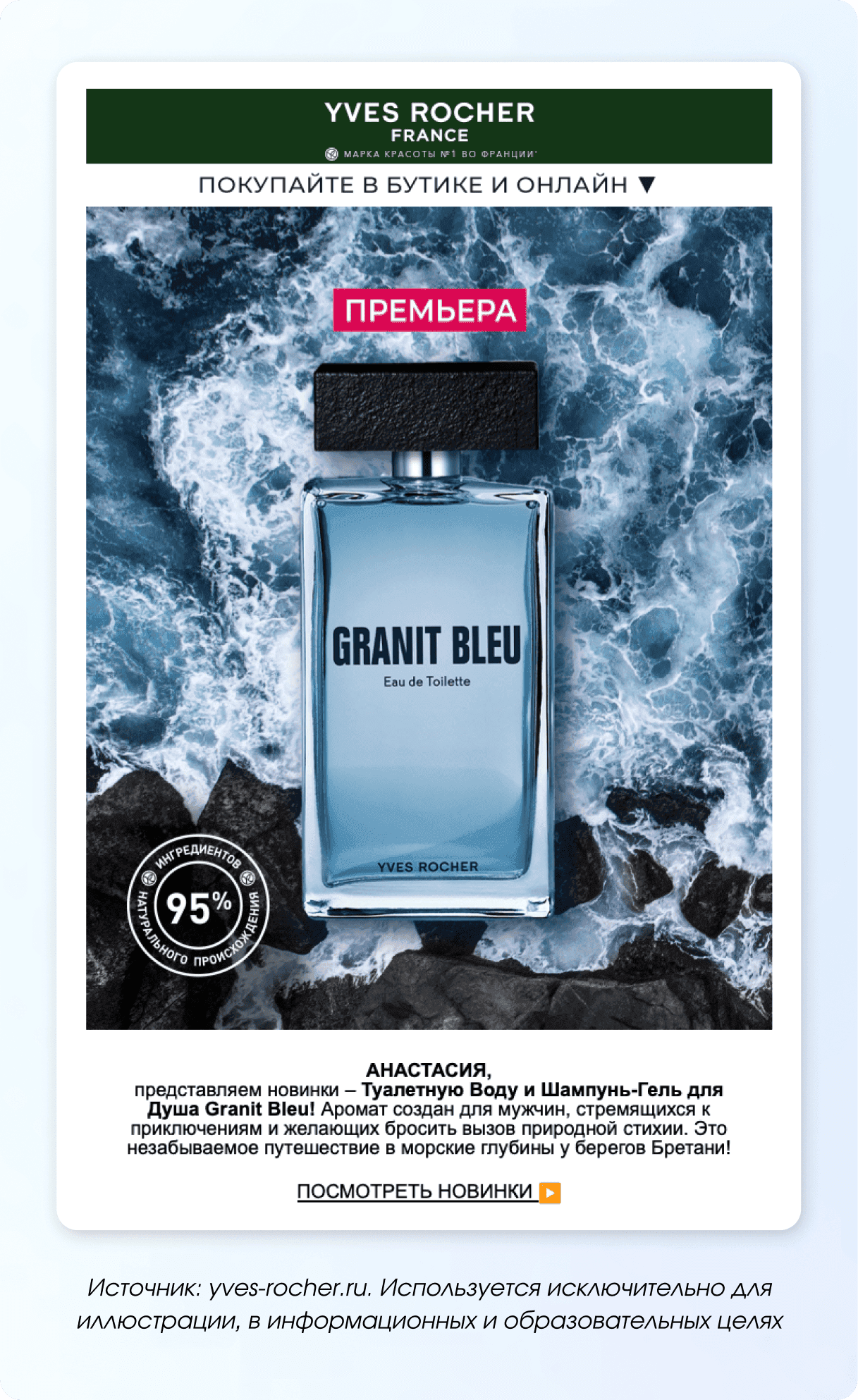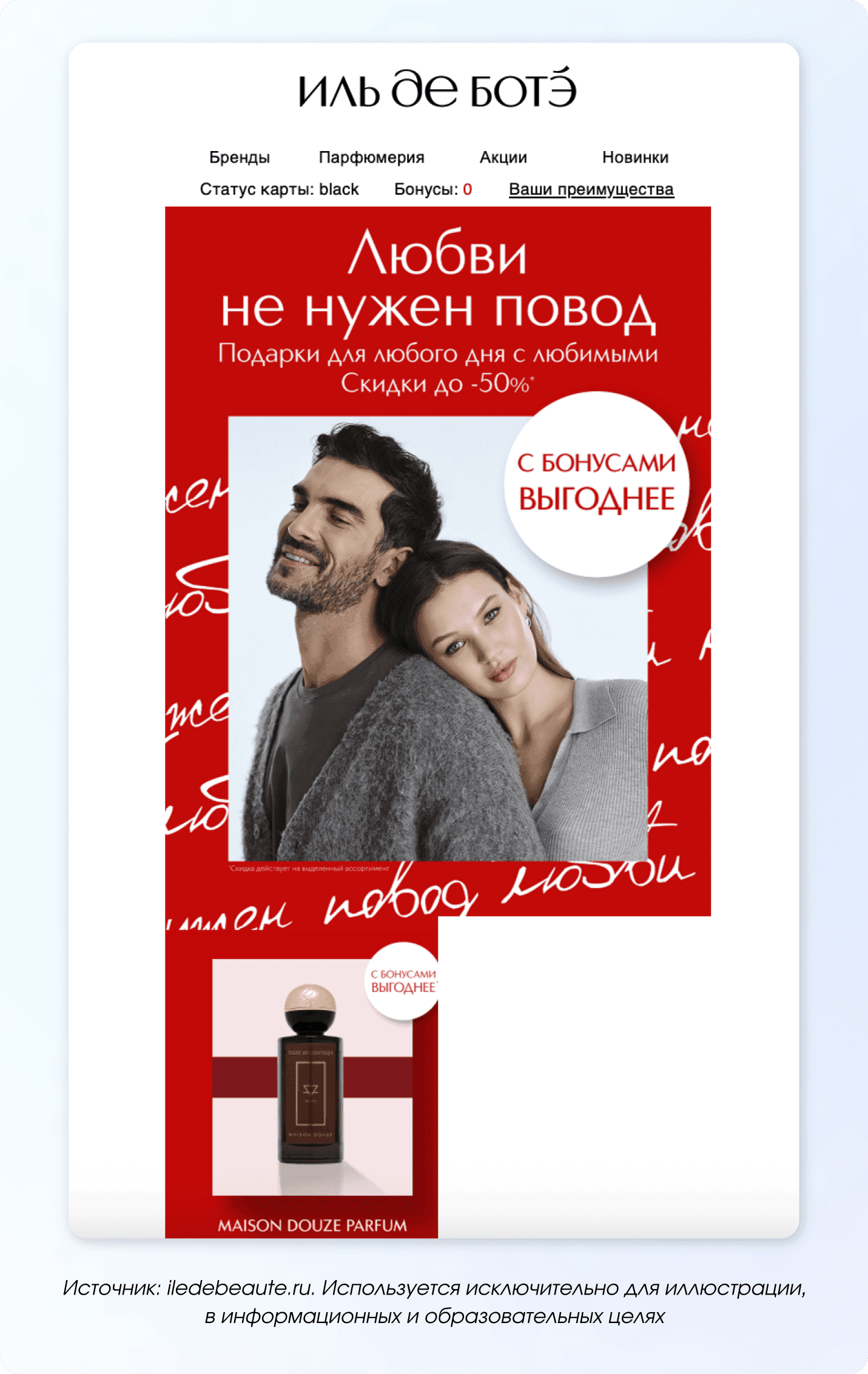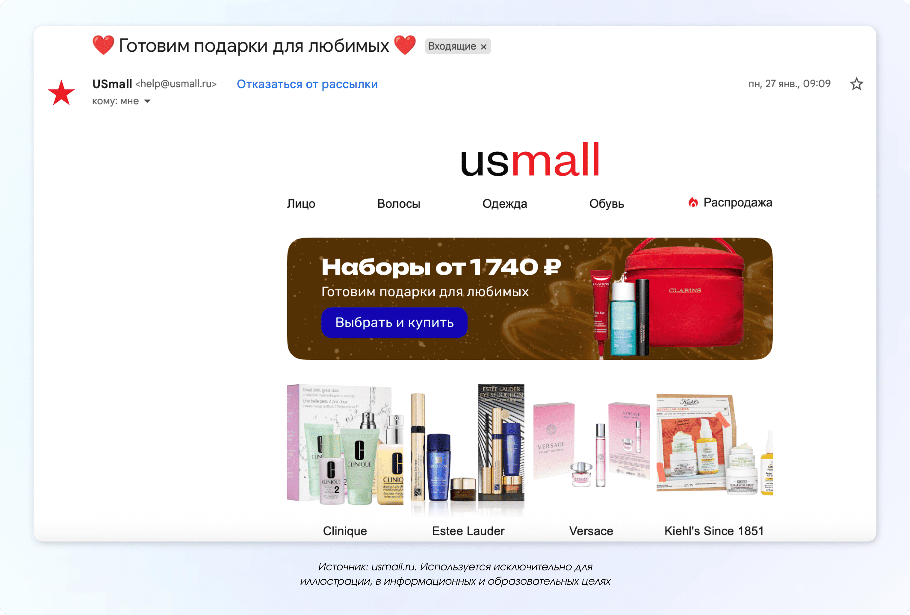 Рассылка, за которую пользователи будут вам благодарны. Просто идеи подарков, наборы — предложите варианты, чтобы клиенты не ломали голову, что купить любимым. Например, бренд косметики может мягко напомнить, что у него есть мужская линейка — и показать новинку, которую удобно взять в подарок мужчине.