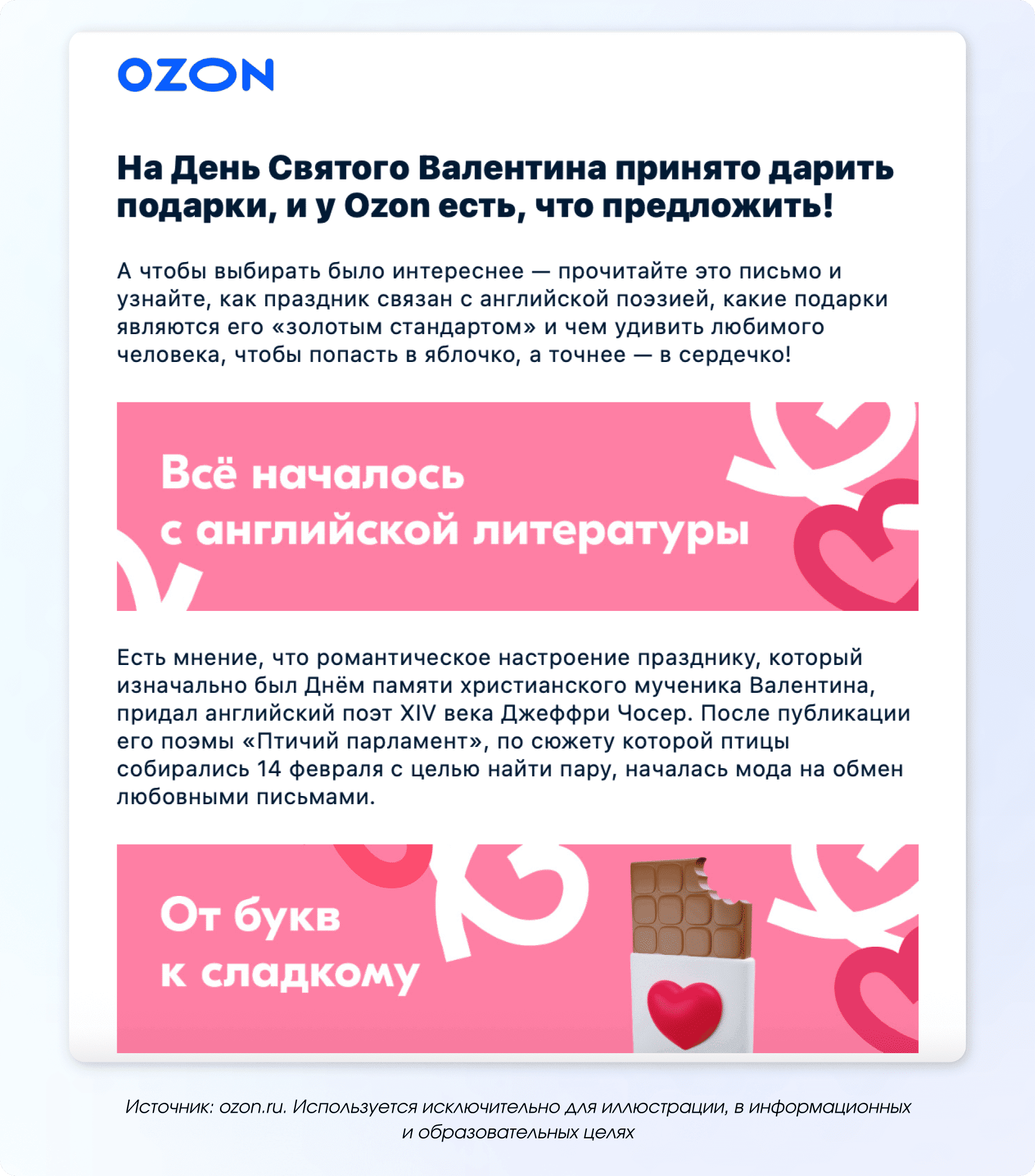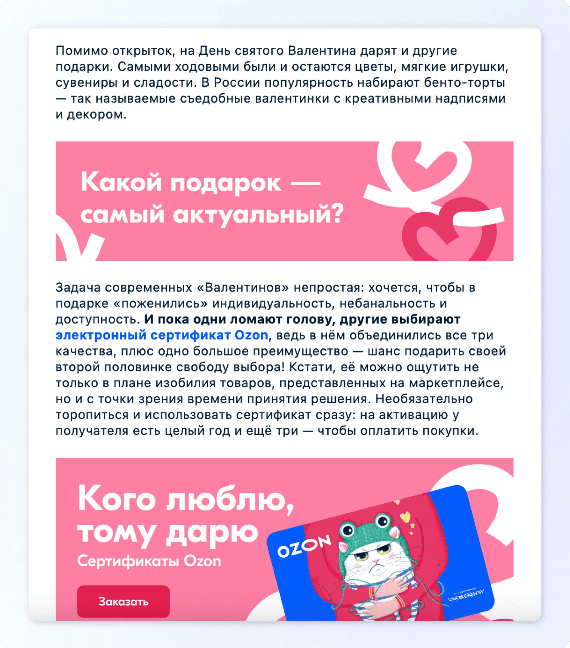 Такой формат можно вынести в отдельную стратегию и использовать как полноценный продающий инструмент. Чаще всего он лучше работает в email-рассылках. Например, маркетплейс сначала рассказал историю праздника, а затем предложил сертификат как удобный вариант подарка.